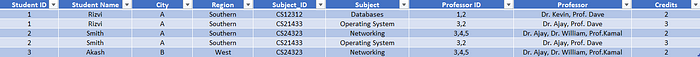 Here we can see multiple lecturers teaching one subject. Hence, the table has multivalued cells. This contradicts the first normal form. So we have to create separate rows for each multi-valued cell as shown below.
