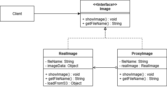 As shown in the code below, users can load images not to view, but just see the image names before selection. In such a case, we can use a Virtual Proxy to avoid fetching real image data for all the images the user requests. And get details from our storage only when the user really requests the image to view.